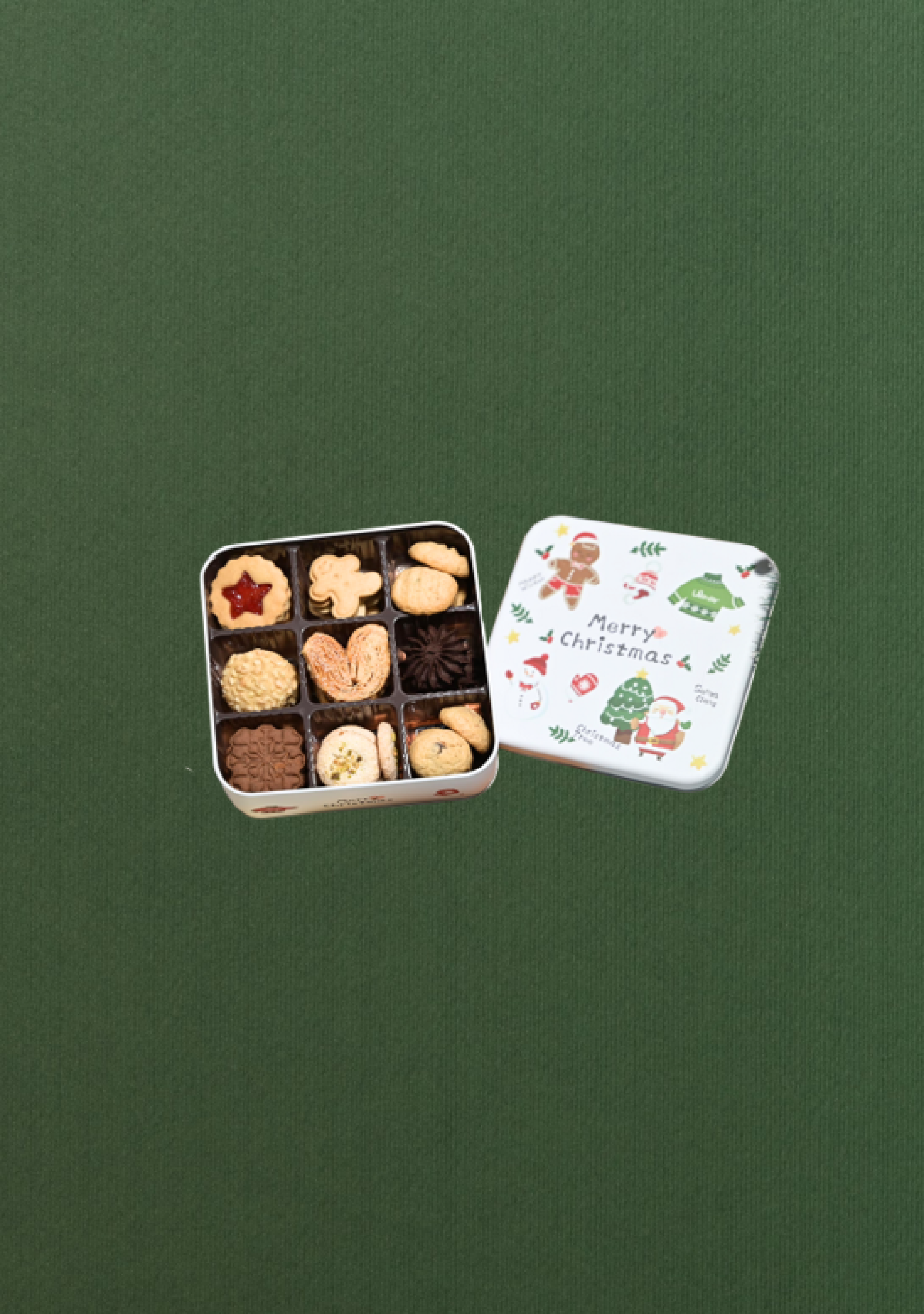 Includes:• Gingerman Cookies• Snowy Cookies• Walnut Chocolate Chunk Cookies• Sandwich Jam Cookies• Nestum Raisin Cookies• Almond Macaroon Cookies• Almond Nib Cookies• Chocolate Butter Cookies• Palmier Cookies